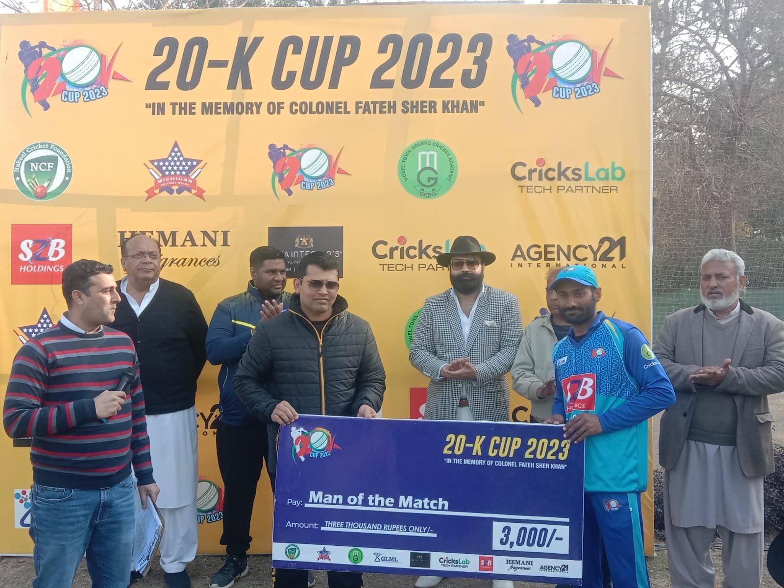 For his all-round performance, Ali Zafar of Cricket Center was adjudged as player of the match, who was handed over the award by Bilal Javaid, nephew of the sponsor of the event – Mr. Nabeel Ahmad, son of Col Fateh Sher Khan.