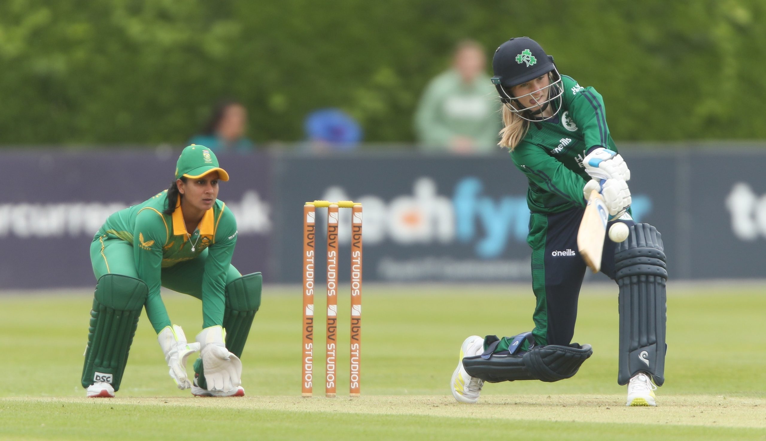 The second and third wickets followed soon after, with Leah Paul edging Ayabonga Khaka to slip and Rachel Delaney bowled playing across the line to Ismail, and Ireland were in deep trouble at 4-3.
